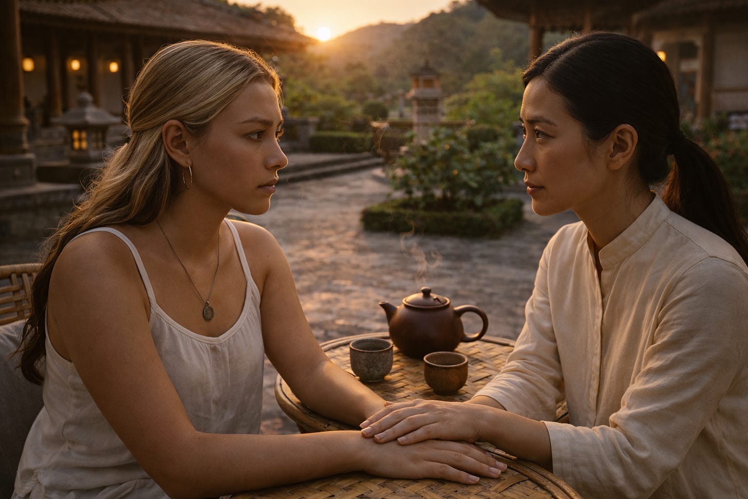 Sie sah zu Mei-Li hinüber, die jetzt still im Garten stand und mit Bhante Surya sprach. Ihre Silhouetten zeichneten sich im Abendlicht ab, warm und friedlich, fast wie aus einer anderen Welt.
