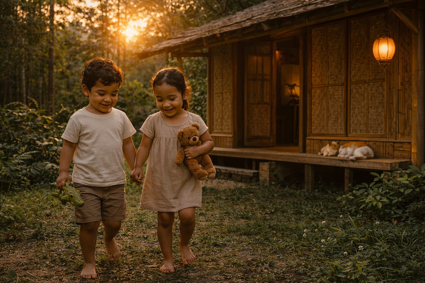Die Kinder hatten sich sofort verliebt. Sie liefen barfuß über den warmen Stein, lachten, folgten den Katzen, die sich um ihre Beine schlangen, als hätten sie sie erwartet. Ihre Stimmen mischten sich mit dem Gesang der Mönche aus der Ferne, sie klangen wie das helle Zwitschern der Vögel in der Abendluft.