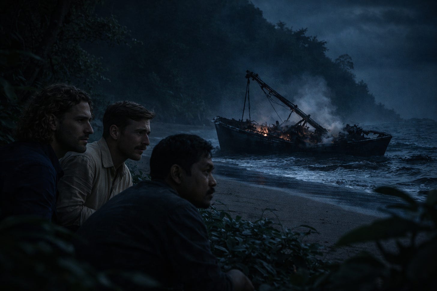 Unten am Strand, kaum fünfzig Meter entfernt, ragten die verkohlten Überreste des Kutters aus dem Wasser, der Rumpf schwarz, geborsten. Der Mast lag im Sand, schief wie ein Kreuz.